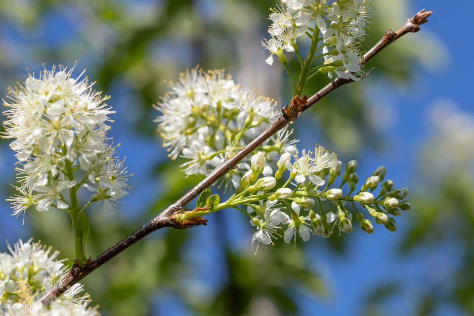De schors van de stam en oudere takken hebben een opvallend geelbruine tot kopergele kleur en bladert af. De heldergroene bladeren verkleuren opvallend geel in de herfst. In april verschijnen er witte heerlijk geurende bloemen. Deze worden gevolgd door kleine zwarte vruchten.