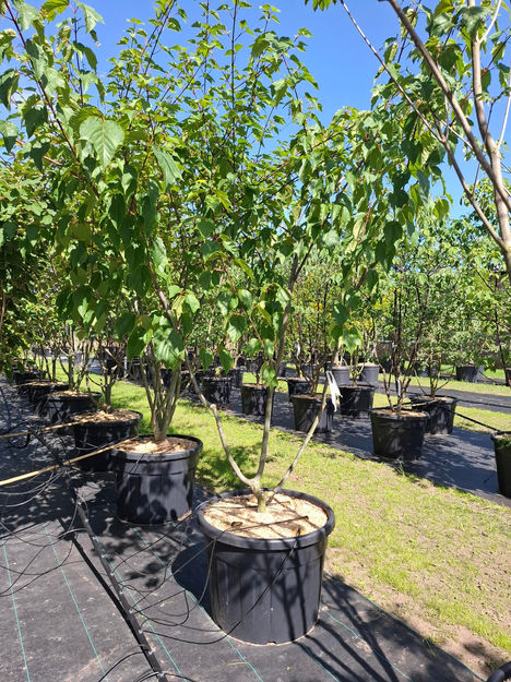 De bast is blauwgrijs met opvallende zilvergrijze strepen. De glanzende groene bladeren zijn kleiner en kleuren mooi donkergeel in de herfst. In april komen de geelgroene bloemen in hangende trossen.