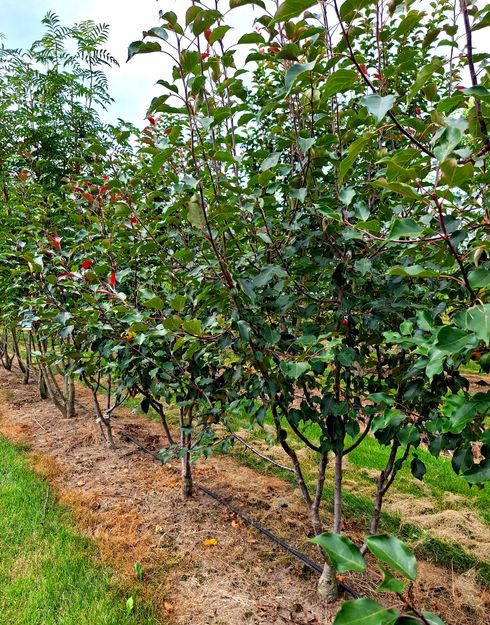 Het jonge donker bruinrode blad kleurt in de zomer donkergroen met een ietswat rode gloed. De bloemknoppen zijn bruinpaars en eenmaal geopend komen de donker paarsroze bloemen die talrijk bloeien. Na de bloei komen de talrijke kleine oranjegele vruchten tevoorschijn, deze blijven echter niet heel lang aan de struik.
